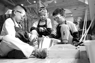 沈陽市育才幼兒園的孩子們在木工坊做游戲。幼兒園 供圖