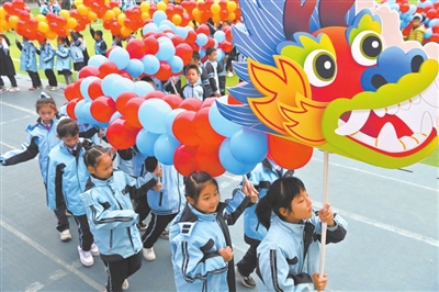 近日,廣西南寧市民族大道東段小學學生在體育節開幕式上享受舞龍的快樂。在體育節開幕式活動上,孩子們以舞龍、武術、舞蹈等方式,盡情享受運動的快樂。