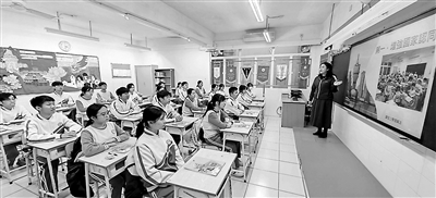 ②澳門東南學校的馮業楓老師在廣州華南師范大學附屬中學的“粵港澳同一堂課”教學現場與學生互動。 資料圖片