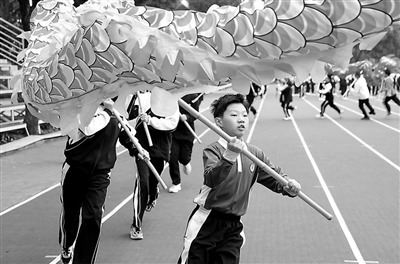 ▲12月23日,深圳大學(xué)附屬中學(xué)初中部的學(xué)生們?cè)隗w育課上學(xué)習(xí)舞龍。
