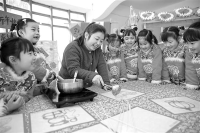 2024年12月31日,江蘇省如皋市下原鎮下原幼兒園開展“學做非遺糖畫 繪出甜蜜新年”活動,孩子們穿著喜慶的服裝體驗糖畫制作、品嘗糖畫,與糖畫“零距離”甜蜜接觸,喜迎新年。 徐慧 攝