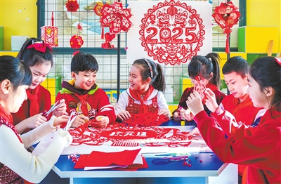 近日,內蒙古呼和浩特市玉泉區五塔寺東街小學學生在制作迎新年剪紙作品。學校開展“多彩活動迎新年”主題活動,讓孩子們在歡聲笑語中迎接新年的到來。丁根厚 攝