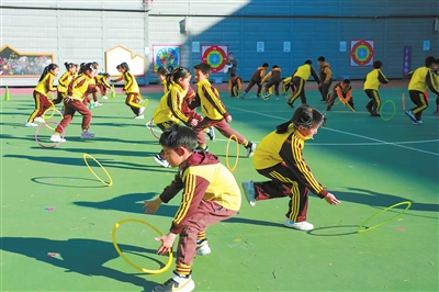 在西城區復興門外第一小學,學校黨支部牽頭制定了《學校優化課間活動實施方案(試行版)》,明確了“2+2”課間活動模式,即2個30分鐘大課間和2個15分鐘小課間,大課間學校統一管理,小課間自主活動。學校黨支部、德育處牽頭重新規劃校園場地、配齊游戲用具、堅持常態管理以滿足學生課間活動需求。