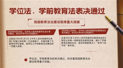 2024年4月26日,《中華人民共和國學位法》表決通過,自2025年1月1日起施行。這是自1981年1月1日《中華人民共和國學位條例》實施以來的第一次全面修訂,豐富完善了中國特色學位制度,是學位工作和教育法治建設的一項重大成果。2024年11月8日,《中華人民共和國學前教育法》表決通過,自2025年6月1日起施行。這是自2002年《中華人民共和國民辦教育促進法》制定以來第一部新制定的教育法律,填補了學前教育法律的空白,推動學前教育步入“有專門法可依”新階段。學位法、學前教育法的表決通過,標志著我國教育法治建設取得重大突破。