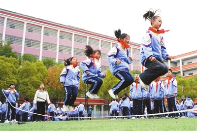 圖⑦ 江西省宜春市上高縣第四小學的孩子們利用課間十分鐘參加跳繩活動。 陳旗海 攝