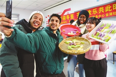 圖⑩ 在江蘇省鎮江市金湖社區,江蘇大學的外國留學生與包好的餃子自拍“合影”。 石玉成 攝