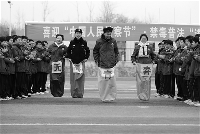 1月7日,在湖北省荊門市沙洋縣職業技術教育中心,沙洋縣公安局禁毒民警通過“袋鼠跳”趣味游戲互動方式,向青少年宣傳禁毒知識。連日來,沙洋縣公安局聯合教育部門組織開展“喜迎中國人民警察節·禁毒普法進校園”主題宣傳活動,向青少年宣傳禁毒知識,進一步增強青少年識毒、防毒、拒毒的能力。