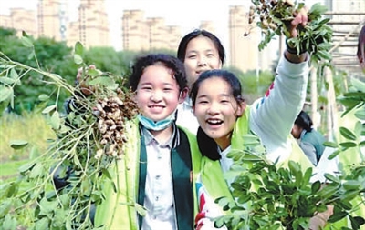 ③沈陽市渾南區白塔小學學生展示親手收獲的花生。學校供圖