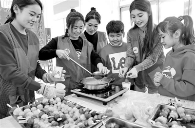 1月23日,河北省秦皇島市海港區(qū)河?xùn)|街道工人北里社區(qū)志愿者帶領(lǐng)小朋友制作冰糖葫蘆。當(dāng)日,該社區(qū)開展“串童年趣味 共迎新春佳節(jié)”活動,社區(qū)志愿者帶領(lǐng)小朋友體驗制作糖葫蘆,豐富假日生活,共同迎接新春佳節(jié)。 曹建雄 攝
