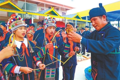 在長期的實踐摸索和專家的指導下,學校決定從增強學生對傳統文化的認同上打開突破口。教師們一起去找寨子里傳承手工藝的老人聊天、學習,盡可能地把傳統習俗和文化融入音樂、美術、體育教學。“孩子們認識到了傳統文化的優勢和價值,自信心就起來了。”李冬梅說。