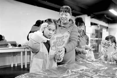 “把4個角按緊,再蘸點顏料,把空隙都填滿……”王蓉麗奶奶用不太流利的普通話,耐心地指導著孩子們進行手工活動——扇面拓印。福字、窗花……在奶奶們的悉心指導下,孩子們制作的一幅幅精美扇面作品逐漸成形。