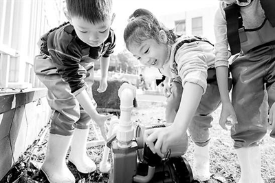 智慧緣起:水是生命之源,節約用水,應該從小做起。當前,節水已經成為全社會的共識。在努力踐行這一做法的同時,我們總會發現,幼兒園里的沙池、水池,這些深受孩子們喜愛的游戲場,不可避免地存在著大量的水流失現象。沙與水是對孩子們非常具有吸引力的“玩具”,我們通過與孩子們對話、與家長對話、與設施設備工作人員對話,以幼兒園假期改建為契機,開展了幼兒園里的“水循環”這一節水活動。