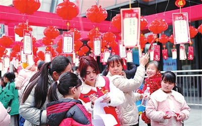 2月11日,在重慶永川青少年宮趣味游戲區(qū),家人帶著孩子在猜燈謎。當日,共青團重慶市永川區(qū)委、重慶市永川區(qū)少工委舉辦“福蛇元宵,年味非遺”元宵游園會,設置非遺項目體驗區(qū)和趣味游戲區(qū),讓孩子們和家長在這里樂迎元宵節(jié)。