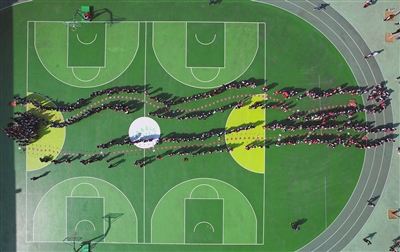 2月26日,河北省石家莊市草場街小學學生在觀賞龍頭蜈蚣風箏(無人機照片)。“二月二”臨近,當地中小學邀請風箏制作民間藝人作為校外輔導員,介紹風箏文化和制作技藝,讓學生感受傳統文化魅力。 新華社發