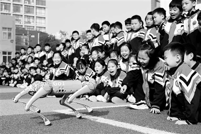 ①河北省邯鄲市邯山區(qū)農(nóng)林路小學(xué)學(xué)生與機(jī)器狗互動(dòng)。郝群英 攝