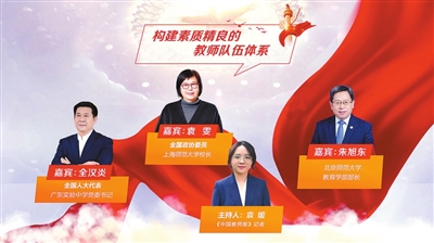 日前,全國政協委員、上海師范大學校長袁雯,全國人大代表、廣東實驗中學黨委書記全漢炎,北京師范大學教育學部部長朱旭東做客中國教育報刊社“兩會訪談錄”,圍繞“構建素質精良的教師隊伍體系”建言獻策。