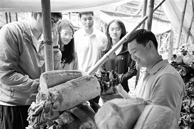 近日,羅燦在實驗室和學生交流白背毛木耳母種繁育情況。