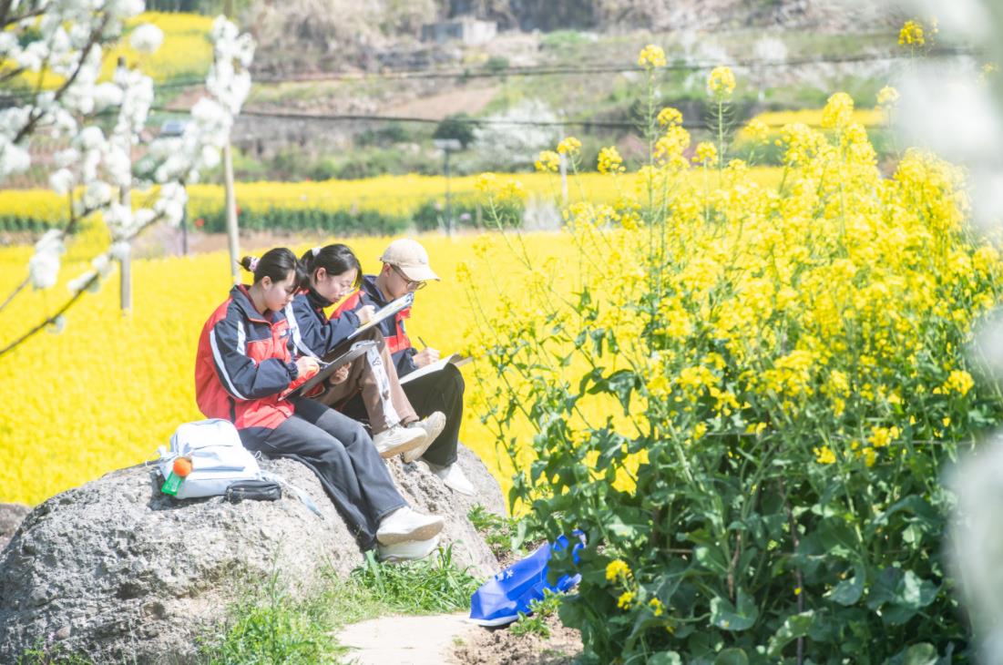3月20日,重慶市巫山縣福田鎮的學生在油菜花田里寫生。新華社記者 唐奕 攝