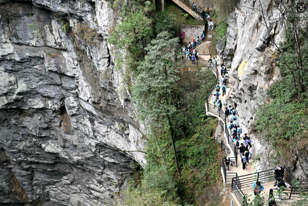 3月21日,湖北省宣恩縣清源高中的師生們行進在鑼圈巖天坑的絕壁棧道上。 新華社發
