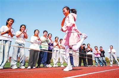 3月26日,江蘇省南通市通州區(qū)金樂(lè)小學(xué)的學(xué)生在課間“跳橡皮筋”。該校通過(guò)跳皮筋、滾鐵環(huán)、擲沙包等趣味項(xiàng)目讓學(xué)生在游戲中強(qiáng)健體魄。