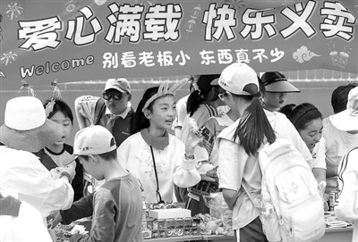 3月26日,浙江省湖州市德清縣實驗學校學生正在義賣商品。當日,該校開展校園愛心義賣活動,學生們將閑置的學習用品、書籍、玩具等進行公益義賣,所得收益用于幫助西部結對學校的小伙伴們。王樹成 攝