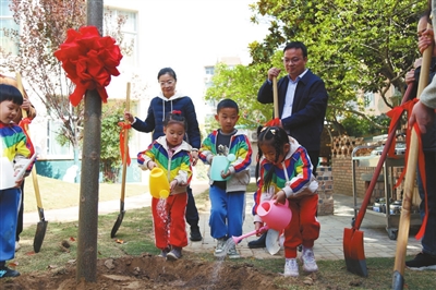 近日,河南焦裕祿干部學(xué)院教師和開封市實(shí)驗(yàn)幼兒園小朋友一起栽種“二代焦桐”。 程振華 攝