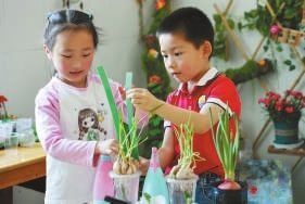 近日,浙江省諸暨市暨南街道街亭幼兒園的孩子們在為植物“量身高”。陳霞芳 攝