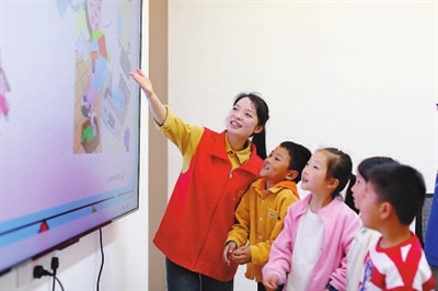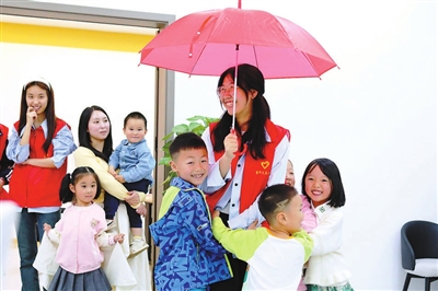 左圖:大學(xué)生志愿者和孩子們一起玩主題游戲。