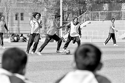 大圖:在阿圖什市硝魯克中學,阿圖什市U13女子足球隊球員在訓練中進行分組比賽(4月10日攝)。