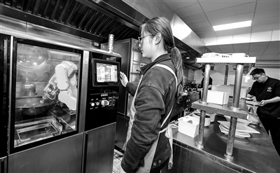 在可濃餐廳后廚,高約1.6米的“數(shù)字廚師”外形如同一個四方形帶門灶臺,這是一個使用機械臂實現(xiàn)多種烹飪技法的炒菜機器人。打開玻璃門,中央鐵鍋上方有一個透明鍋蓋,下方是電磁爐,右側(cè)是機械臂,鐵鍋四周環(huán)繞著調(diào)料盒、食材籃和廚具架,出油口、清洗口和下水口一應俱全。