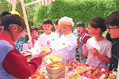 近日,江蘇徐州睢寧李集鎮(zhèn)中心小學學生將親手制作的果盤推薦給同學品嘗。該校舉辦廚藝比賽,100余名學生參與拼盤、烤串、切菜、炒菜等活動,感受勞動樂趣。 洪星 攝