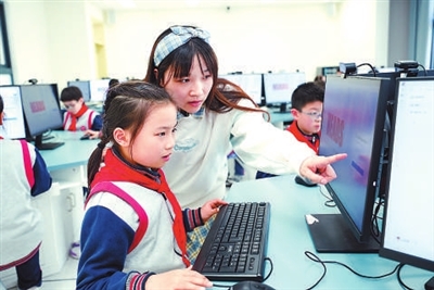 上海市虹口區第二中心小學教師指導學生登錄HEADS平臺了解智能體。學校供圖