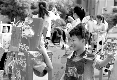 小朋友在進行機器人創意服裝秀展示。