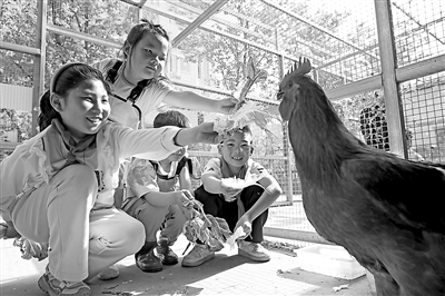 5月8日,在江蘇省徐州市睢寧縣第二小學,參加勞動課的學生給雞、鴨、鵝、小兔子等動物投喂食物。該校在校園內打造了一個生態鏈“動物園”,通過飼養小動物,培養學生們的責任心與吃苦耐勞精神。 洪星 攝