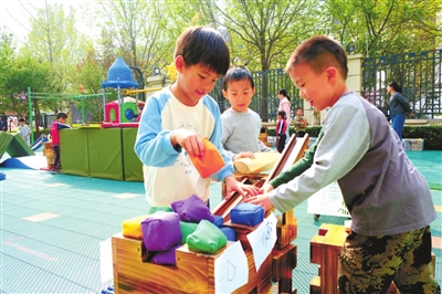 日前,北京師范大學實驗幼兒園龍樾分園開展戶外游戲活動,孩子們利用積木搭建“冰淇淋”生產流水線和售賣部,用不同顏色的沙包充當不同口味的“冰淇淋”,并招呼客人購買品嘗。 王雪 攝