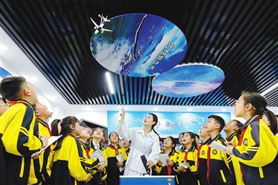 近日,在山東省棗莊市市中區(qū)文化路小學航天科普館,教師在講解“太陽能飛機”飛行知識,為學生普及航天知識,共筑航天夢想。 吉喆 攝