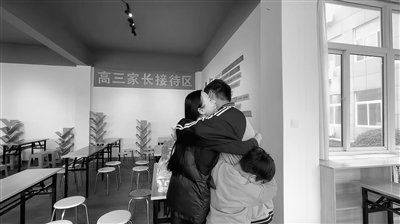 在安丘市實(shí)驗(yàn)中學(xué)家長接待室,學(xué)生熱情擁抱媽媽和弟弟。 安丘市教體局供圖