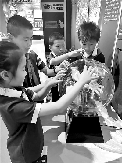 學(xué)生在氣象科普館探索輝光球發(fā)光原理。學(xué)校供圖