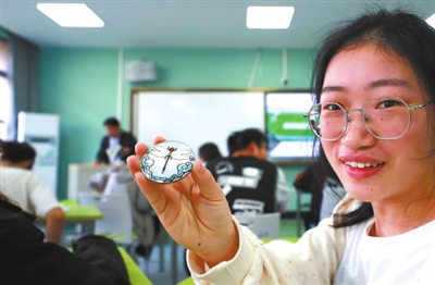 在浙江農(nóng)林大學(xué)智慧教室里,林學(xué)(林業(yè)技術(shù))專業(yè)定向農(nóng)科生徐慧如展示主講老師郭愷副教授獎勵給她的、由老師自己設(shè)計制作的昆蟲冰箱貼。