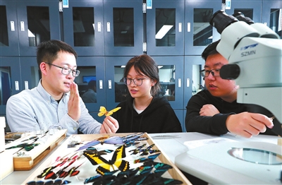 在浙江農(nóng)林大學(xué)7號教學(xué)樓的標(biāo)本室里,王吉銳老師(左)在指導(dǎo)植物保護(hù)專業(yè)定向農(nóng)科生制作昆蟲標(biāo)本。