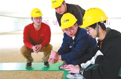 在浙江省糧食局直屬糧油儲備庫里,在這里工作的浙江農(nóng)林大學(xué)2022屆食品科學(xué)與工程(糧油儲檢)專業(yè)定向農(nóng)科生朱嘉駿(右二)在指導(dǎo)學(xué)弟們進(jìn)行畢業(yè)實習(xí)。