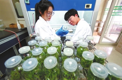 在浙江農(nóng)林大學(xué)智能樓的鐵皮石斛育苗室里,林學(xué)(林業(yè)技術(shù))專業(yè)定向農(nóng)科生葉沛陽(右)在跟隨研究生學(xué)姐進(jìn)行專業(yè)實踐。