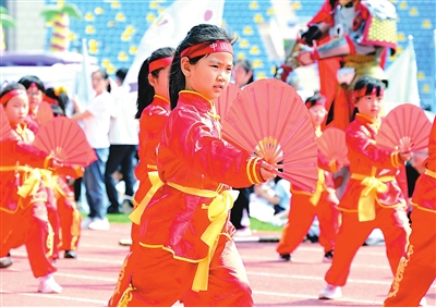 5月30日,青島鎮江路小學學生表演太極扇。“六一”國際兒童節臨近,孩子們在豐富多彩的活動中迎接屬于自己的節日。 新華社記者 李紫恒 攝