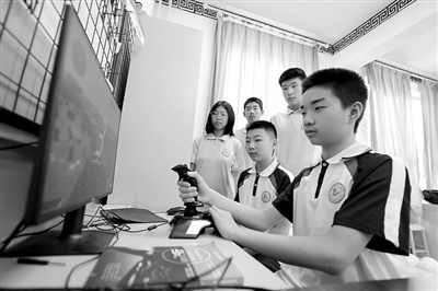 5月30日,內丘縣第二中學學生在進行模擬飛行操控。
