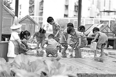 深圳市第六幼兒園農耕園的雨水池里,孩子們與水中的小魚歡樂互動。蔡信能 攝