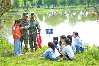 近日,在安徽省合肥市廬陽區三十崗鄉柴沖村,民兵在向學生示范救生衣的穿戴。安徽省合肥市廬陽區三十崗鄉武裝部聯合古城小學通過普及防溺水常識、演示緊急互救方法、體驗救生器材操作等,強化防溺水安全教育。