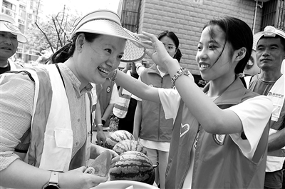 6月16日,在江蘇省鎮江市黃山社區,江蘇大學志愿者為環衛工人送上風扇帽、西瓜。當日,江蘇省鎮江市潤州區寶塔路街道黃山社區聯合江蘇大學志愿者開展“為環衛工送清涼”活動,為“城市美容師”送上夏日關懷。