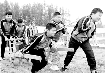 山東省棗莊市嶧城區(qū)陰平鎮(zhèn)傳開希望小學(xué)學(xué)生體驗(yàn)耕種勞作。孫晉之 攝