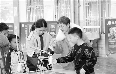 在桂林市平山小學(xué)2024年科技節(jié)STEAM項(xiàng)目比賽中,李荔平老師指導(dǎo)學(xué)生調(diào)試“投石機(jī)”。 資料圖片