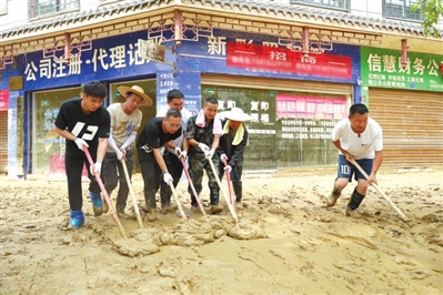 6月26日,林進標(左一)在貴州省榕江縣新城區清淤。